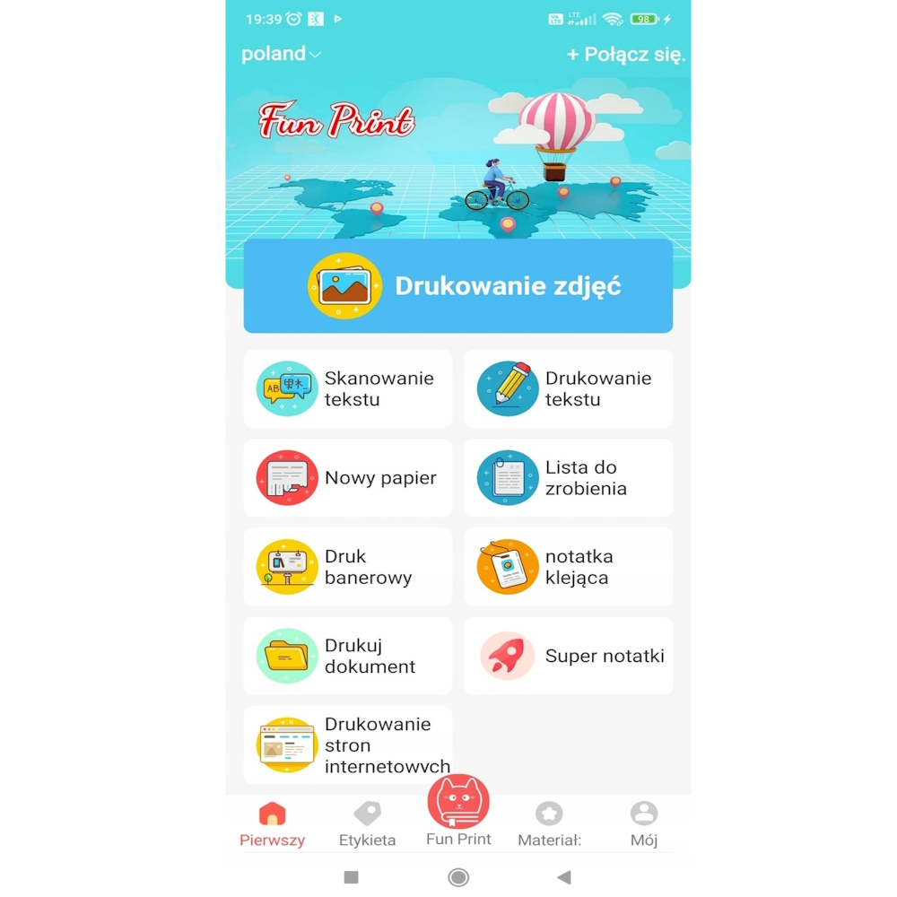 Aplikacja w telefonie “Fun Print” łączy się aparatem przez Bluetooth. Menu jest w języku polskim. Aplikajca jest łatwa w obsłusze i nawet młodsze dzieci poradzą sobie z jej obsługą.