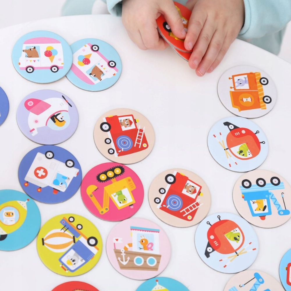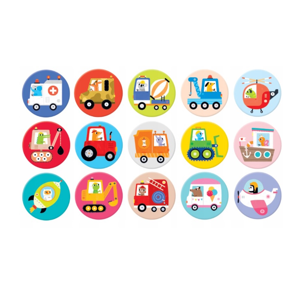 Kierowcy przeróżnych pojazdów zapraszają do wspólnej zabawy. Edukacyjny zestaw zawiera 30 dużych elementów. Znakomicie sprawdzi się jako pierwsza prosta gra pamięciowa.