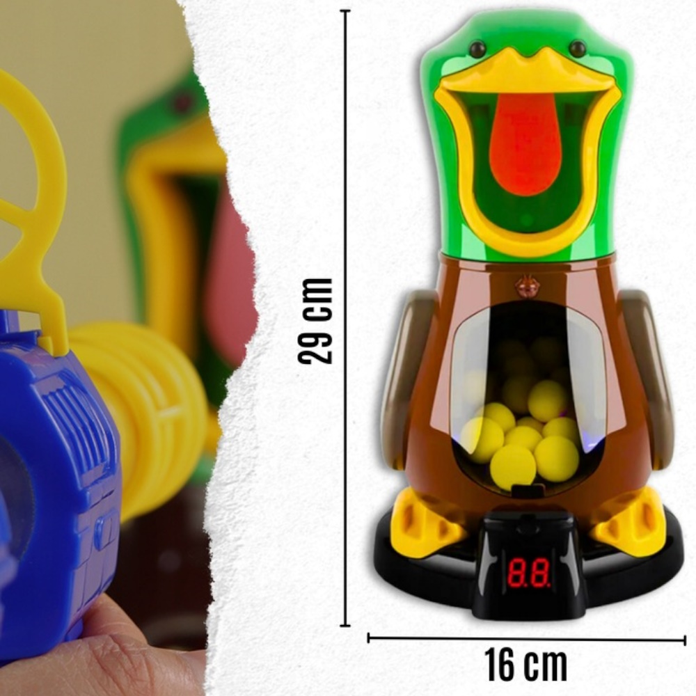✔️Kierujemy celownik w stronę języka kaczki i po trafieniu piłeczki do jej wnętrza, zabawka zarejestruje punktację i wyświetli wynik na ekranie.