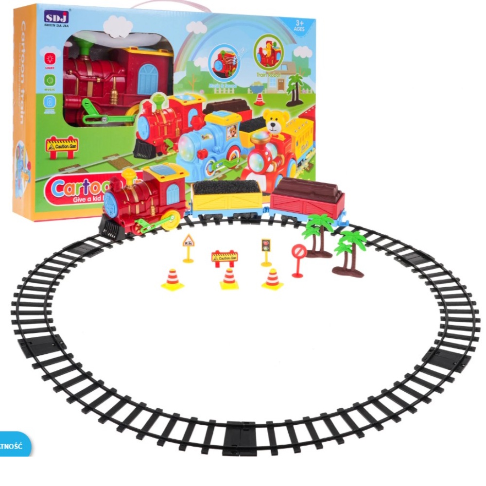 Interaktywna lokomotywa z funkcją dźwięku, światła i torami w zestawie to propozycja dla dzieci od 3-go roku życia. Lokomotywa posiada oświetlenie – migające światełko z przodu, u góry i po bokach kabiny maszynisty. Podczas jazdy słychać też realistyczne odgłosy wydawane przez lokomotywę. W trakcie jazdy kabina maszynisty otwiera się do góry, a ze środka wyłania się postać robota. Do kabiny doczepione są dwa wagony, jeden z węglem, a drugi z drzewem. Zabawka zasilana jest bateriami typu 3 x AA 1,5 V, baterii brak w zestawie.