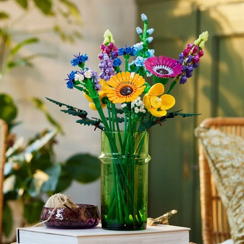 Bukiet z polnych kwiatów z klocków zawiera osiem gatunków kwiatów na regulowanych łodygach. Początkujący floryści lub miłośnicy kwiatów mogą cieszyć się godzinami budowania i odkrywania kwiatów inspirowanych chabrami, lawendą, makami walijskimi, trybulą leśną, paprocią skórzastą, gerberami, ostróżkami i łubinem. Po ukończeniu modelu kwiaty można umieścić w ulubionym wazonie, tworząc piękną ozdobę.