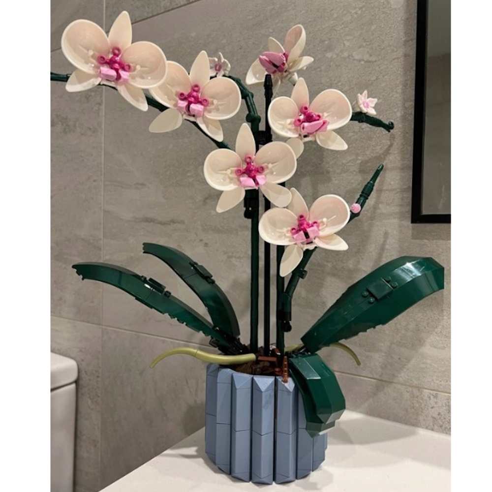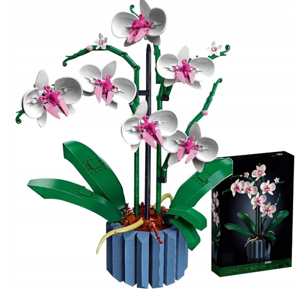 Bez pośpiechu złóż z klocków wszystkie szczegóły biało-różowych kwiatów i wazonu. Inspirowany prawdziwymi orchideami model ma pięć liści u podstawy oraz dwa ruchome korzenie powietrzne, które nadają roślinie realistyczny wygląd.