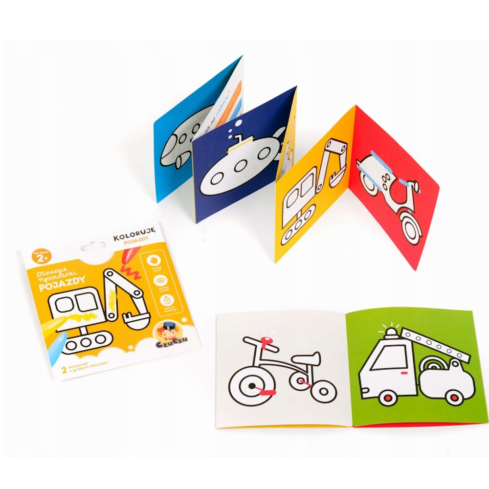 Kredki w dłoń, czas na przygodę z kolorowaniem! Zobaczcie, ile tu pojazdów! Kreatywny zestaw zawiera 2 długie książeczki harmonijki z 23 prostymi ilustracjami z grubymi obrysami, które zachęcają maluchy do sięgania po kredki i rysowania.