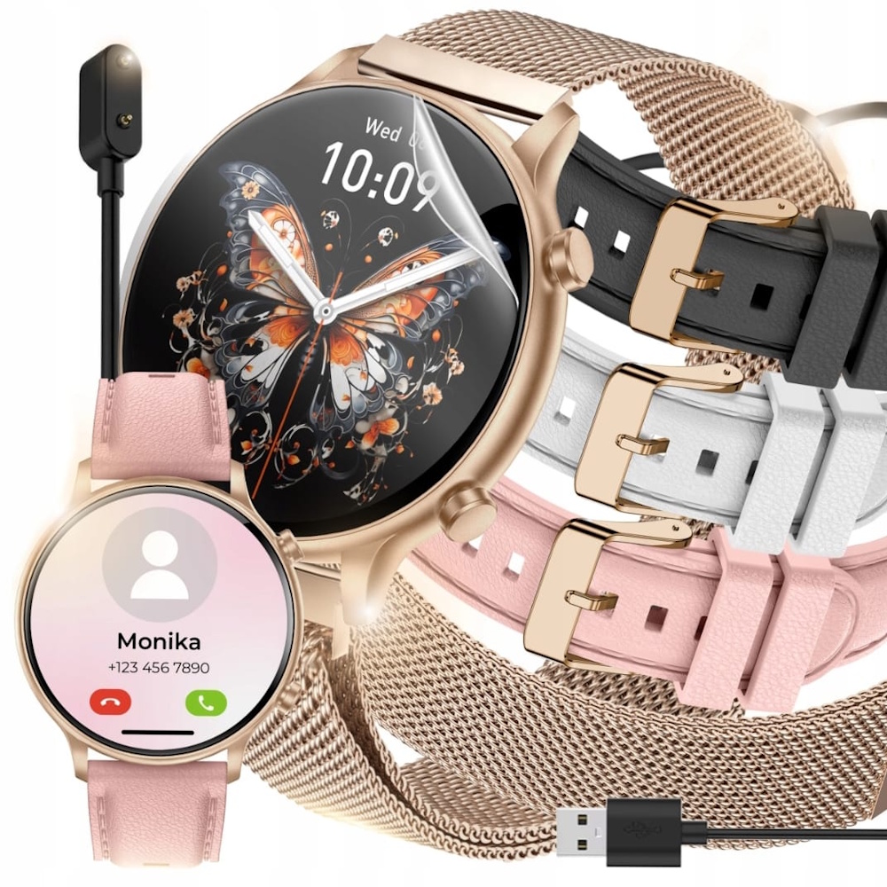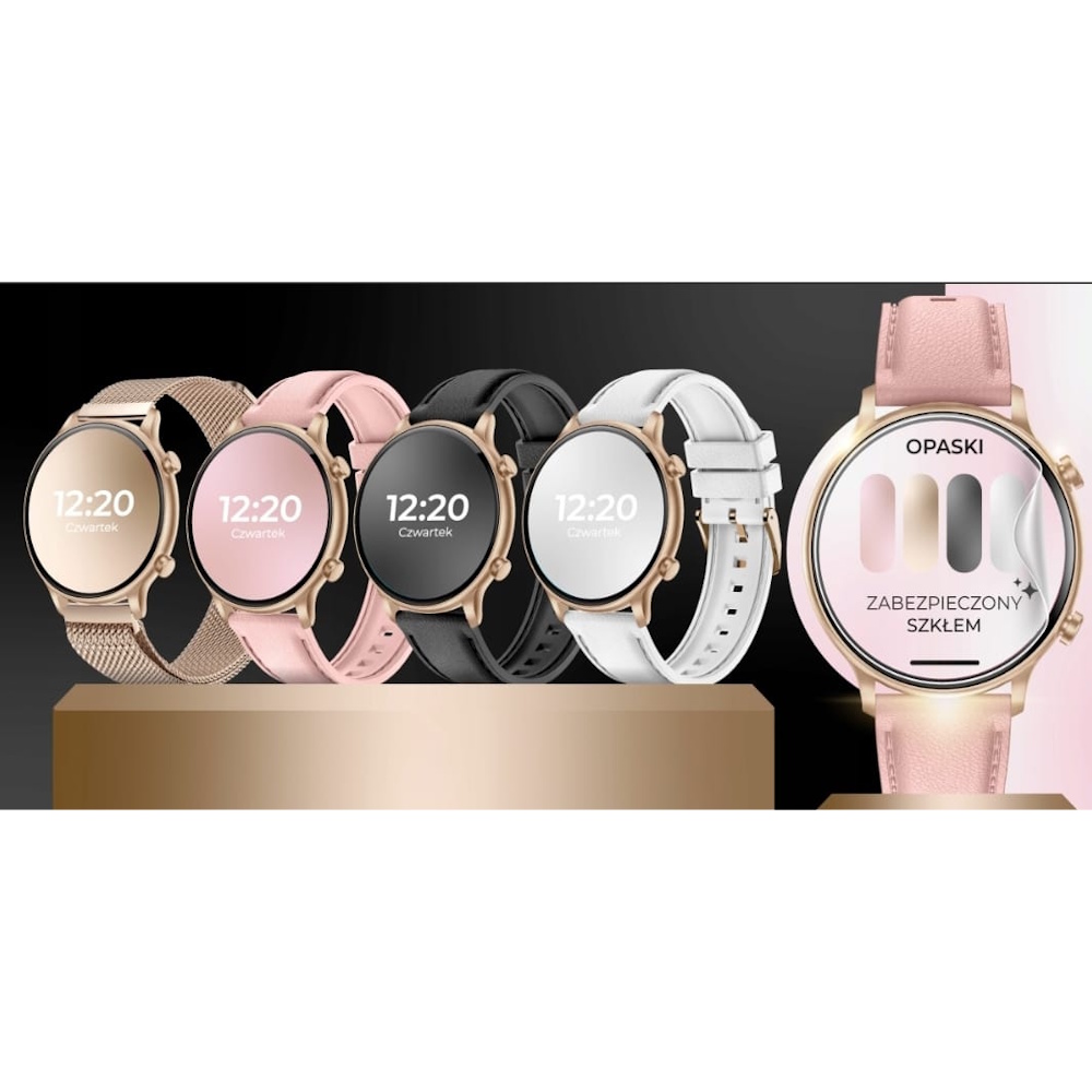 - 4 wymienne paski (stalowa magnetyczna złota bransoleta, różowy pasek silikonowy, gołąbkowy pasek silikonowy, czarny pasek silikonowy)