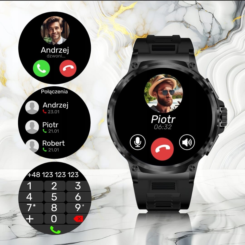 - 📞 Rozmowy przez zegarek: Odbieraj i prowadź rozmowy telefoniczne bezpośrednio z nadgarstka oraz wybieraj numery.