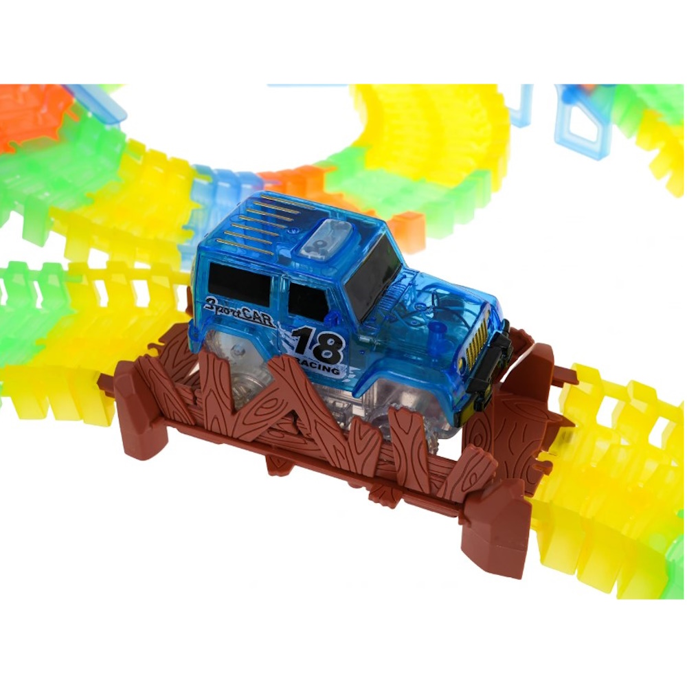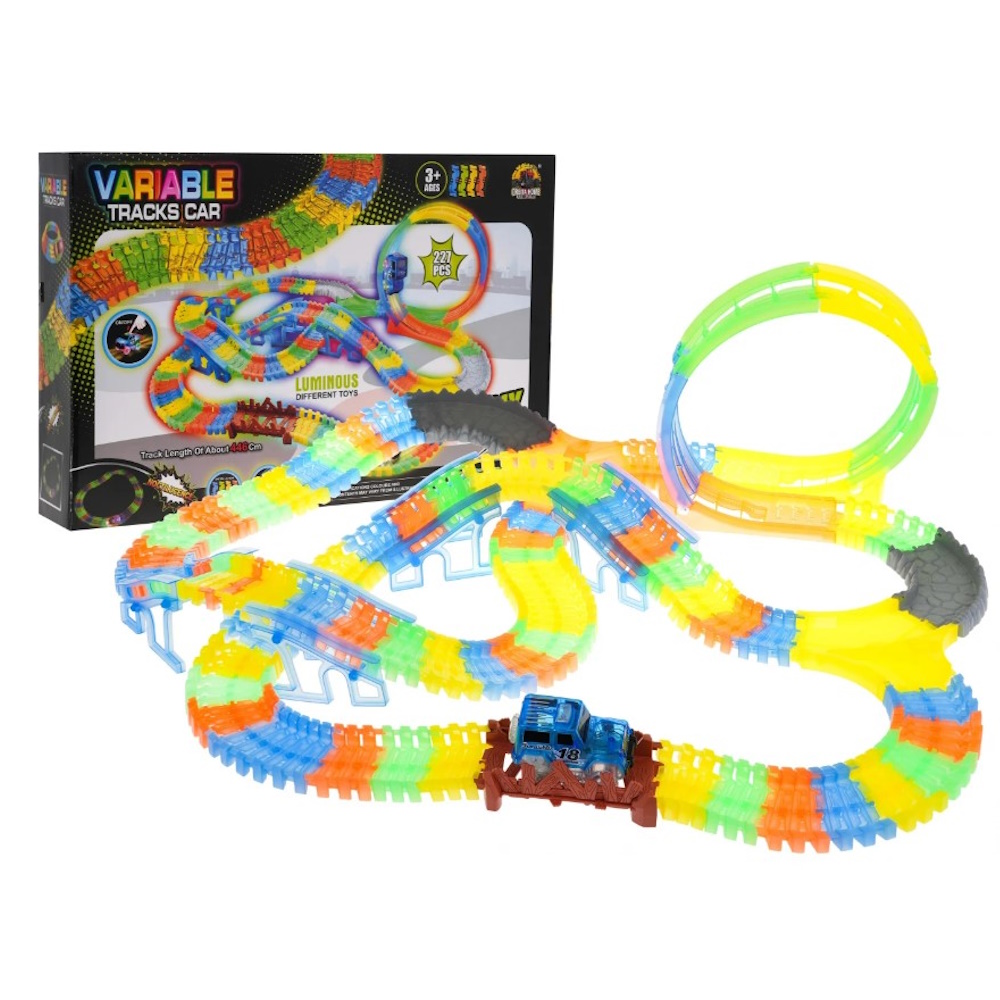 Tor świecący w ciemności z pętlą i autkiem w zestawie to propozycja dla dzieci już od 3- go roku życia. Tory są elastyczne, można je układać w dowolne kombinacje, obracać, podnosić, przekładać i to podczas jazdy autka. Dodatkowo tory są fluorescencyjne, świecą w ciemności. Pojazd dołączony do zestawu, posiada podświetlenie LED, jeżdżąc w ciemności tworzy niesamowity efekt. Pojazd zasilany jest bateriami 2 x AA 1,5V, baterii brak w zestawie. Aby uruchomić autko, wystarczy nacisnąć na jego dachu przycisk. Całkowita długość toru to 446 cm.