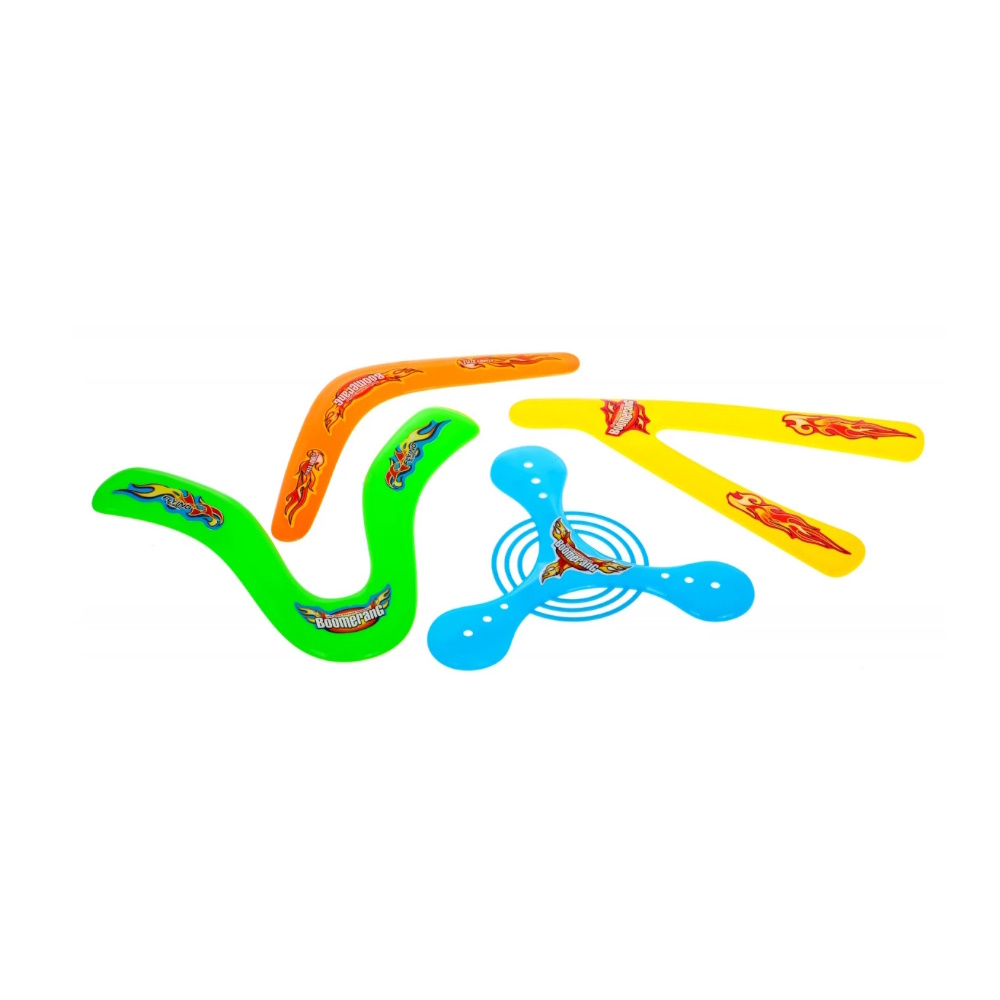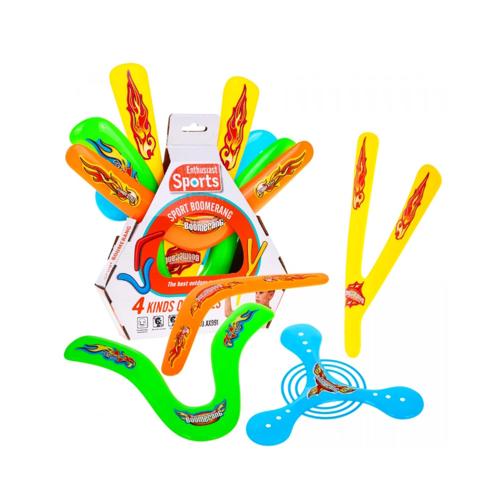 Zestaw 4 bumerangów w różnych kolorach i kształtach to zabawka sportowa przeznaczona dla dzieci od 3-go roku życia. Zapewni Twojemu dziecku kreatywną zabawę na świeżym powietrzu. Zabawa bumerangiem rozwija zwinność, celność, uwagę i szybkość reakcji. Bumerangiem można bawić się samemu lub zespołowo.