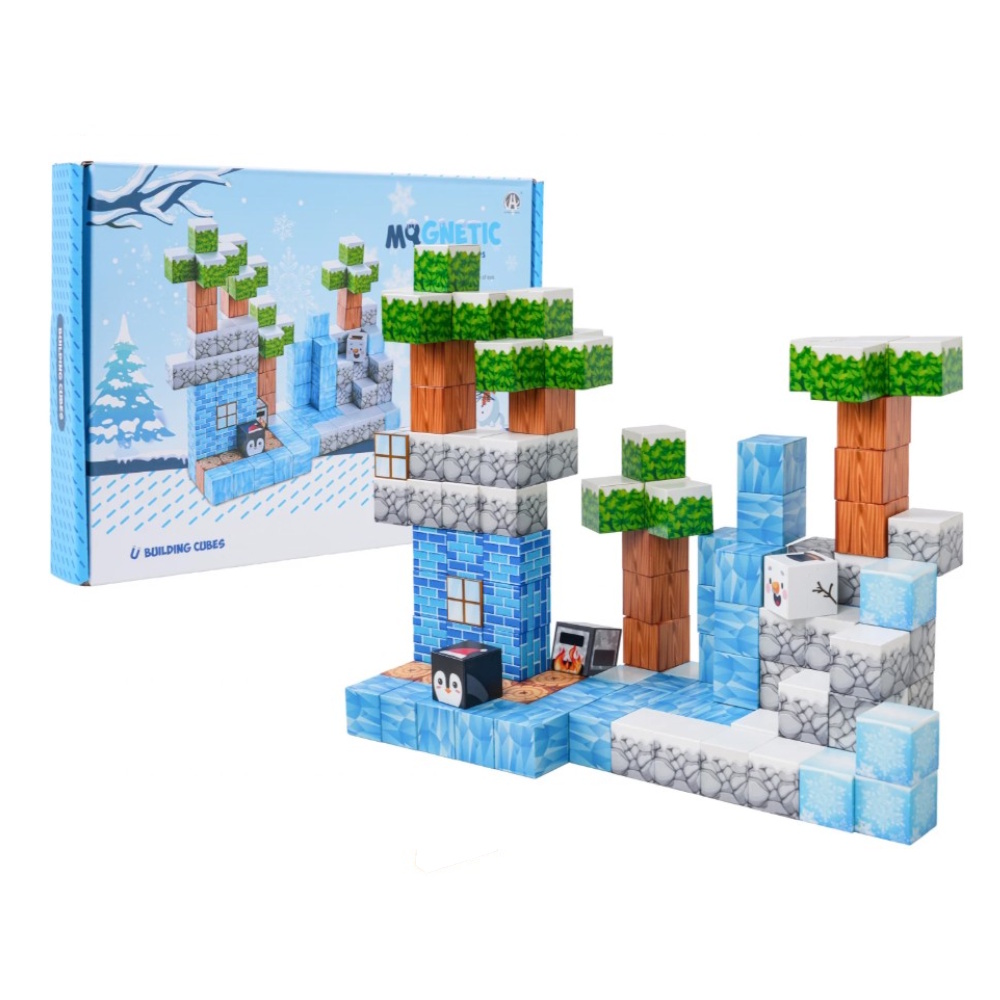 Zestaw 113 kolorowych klocków, magnetycznych kostek 3D dla dzieci od trzeciego roku życia. Klocki magnetyczne wykonano z najlepszej jakości materiałów w żywych kolorach z rysunkami o tematyce zimowej. Kostki imitują lód, rośliny, drewno czy bałwanka lub pingwinka. Można z nich zbudować różne konstrukcje. Magnesy neodymowe bardzo solidnie trzymają, tworząc stabilną konstrukcję. Układanie klocków uczy logicznego myślenia i ćwiczy rączki dzieci.